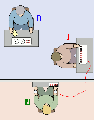 תמונה שלקוחה מאתר וויקיפדיה ומבהירה איך נראה הניסוי של מילגרם. בחדר אחד ישבו החוקר והנבדק ובחדר שני ישב השחקן. הנבדק יכל לשמוע את השחקן ואת קריאות הכאב שלו. בתחילת הניסוי שניהם קיבלו את מכת החשמל ההתחלתית כדי שירגישו במה מדובר. הנבדק חשב שהשחקן הוא עוד נבדק בדיוק כמוהו ושהוא באמת מקבל מכות חשמל.