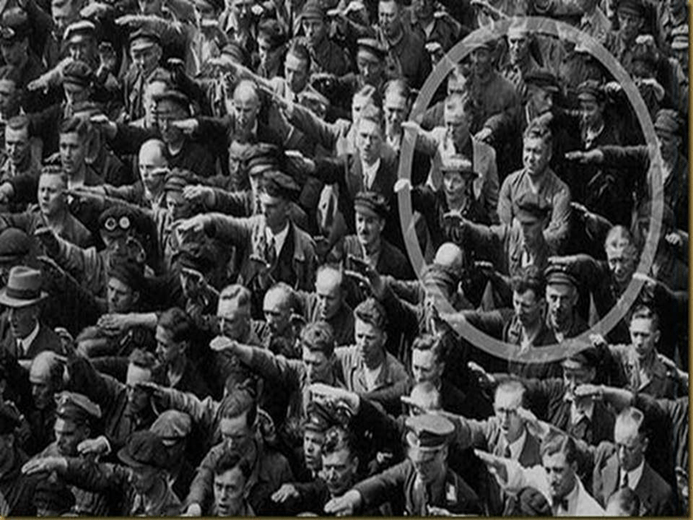 המבורג 1936 חגיגות לכבוד ספינה חדשה. האיש שמוקף בעיגול אינו עושה את מועל היד הידוע של הנאצים.