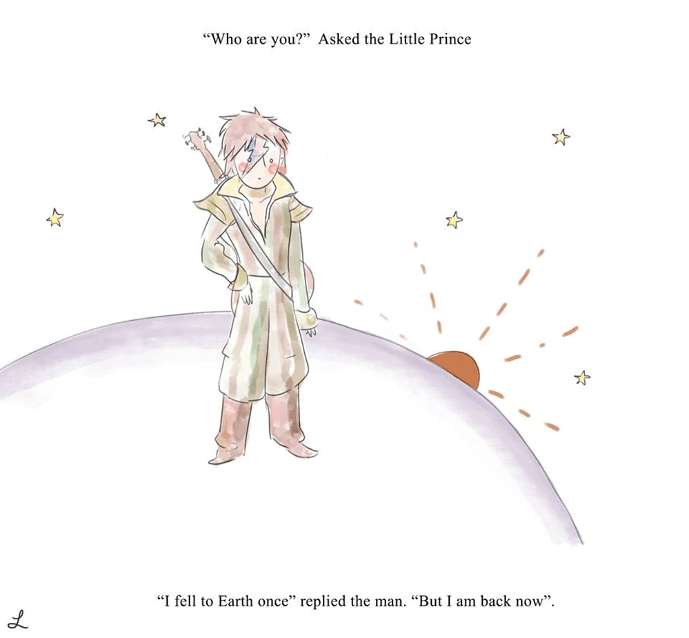 ציור יפהיפה של אמנית ישראלית בשם לי להב (OnlyLeigh מוזמנים להכנס לדף הפייסבוק שלה). "מי אתה?" שאל הנסיך הקטן, "אני נפלתי לכדור הארץ פעם" ענה האיש "אבל חזרתי עכשיו".
